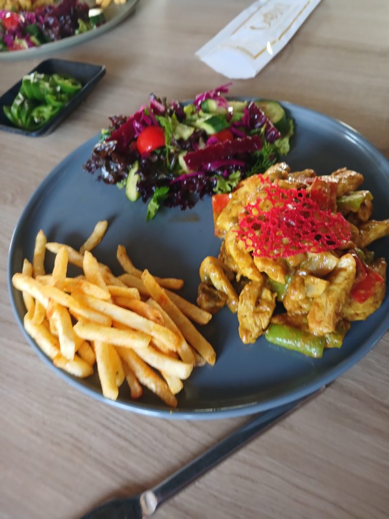 KÖRİ KÖRİ İçindekiler:200 Gr tavuk bonfile- renkli biberler-kültür mantarı-köri-krema-kibrit patates yeşillik ile servis edilir. FİYAT : 350 TL