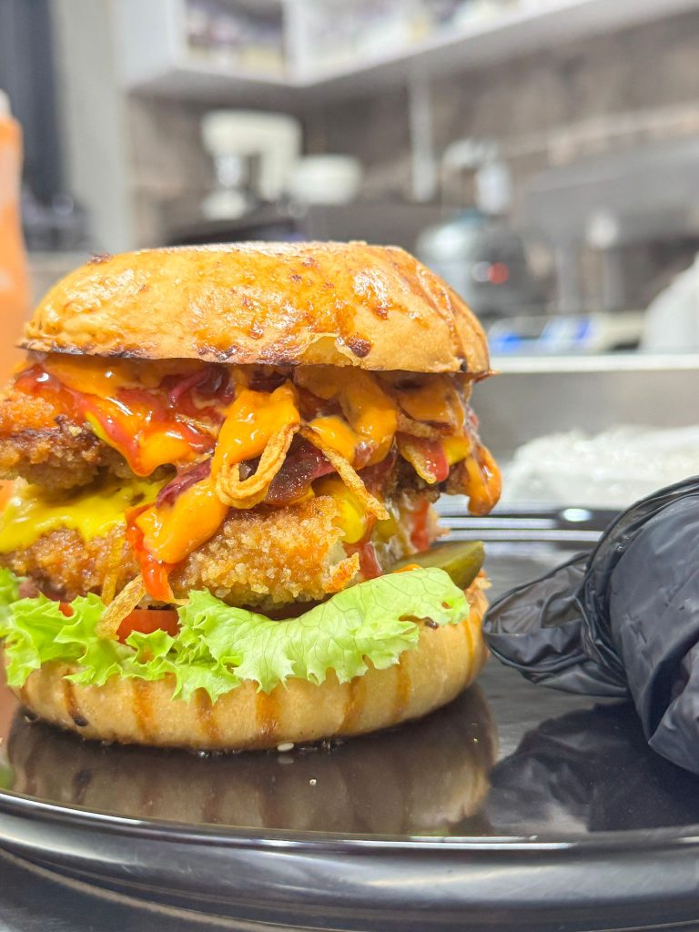 Chıcken Bol Burger İçindekiler:180 Gr paneli tavuk bonfile- domates- kıvırcık marul - kibrit patates-cheddar peyniri- kornişon turşu- çörekotu patates tava-handmade sos ile servis edilir. FİYAT : 300TL